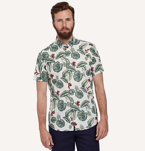Kick back in our classic tropical print short-sleeved shirt. Our variation on the theme is slim cut, to keep you on the stylish side. Extensive testing confirms that this shirt knows the meaning of a perfect summer day. Features include classic F&O buttons, button-down collar, and short sleeves. 100% cotton